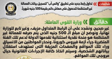 كشف المركز الإعلامى لمجلس الوزراء أنه فى ضوء ما تم تداوله على بعض جروبات تطبيق "واتس آب" رابطًا جديدًا لتسجيل بيانات العمالة غير المنتظمة للحصول على معاش دائم بقيمة 500 جنيه شهريًا، تواصل المركز مع وزارة القوى العاملة، والتى نفت تلك الأنباء، مُؤكدةً أنه لا صحة لإطلاق أى روابط جديدة لتسجيل العمالة غير المنتظمة للحصول على معاش دائم بقيمة 500 جنيه شهريًا، مُشددةً على أن الرابط المتداول مزيف، وغير تابع للوزارة نهائيًا، مُوضحةً أن مبلغ الـ 500 جنيه الذى يتم صرفه للعمالة غير المنتظمة هو منحة نقدية استثنائية تقدمها الدولة لدعم تلك الفئة المتضررة جراء أزمة فيروس كورونا، مُحذرةً المواطنين من الانسياق وراء تلك المواقع والصفحات المزيفة التى تستهدف استغلال بياناتهم الشخصية، وسيتم اتخاذ كافة الإجراءات القانونية حيال مروجى تلك المواقع.