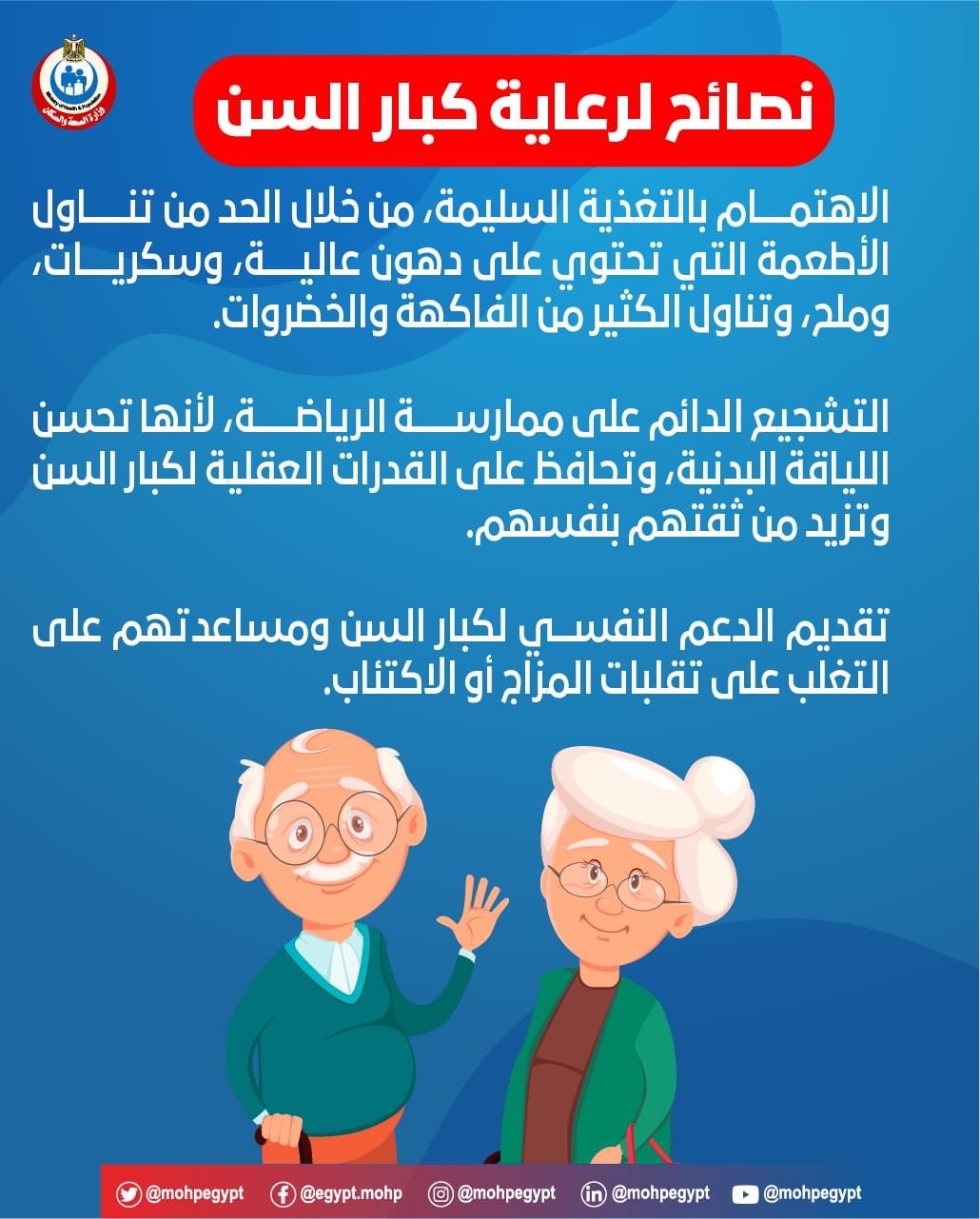 كما أكدت وزارة الصحة على أهمية تقديم الدعم النفسى لكبار السن ومساعدتهم علي التغلب علي تقلبات المزاج أو الاكتئاب .