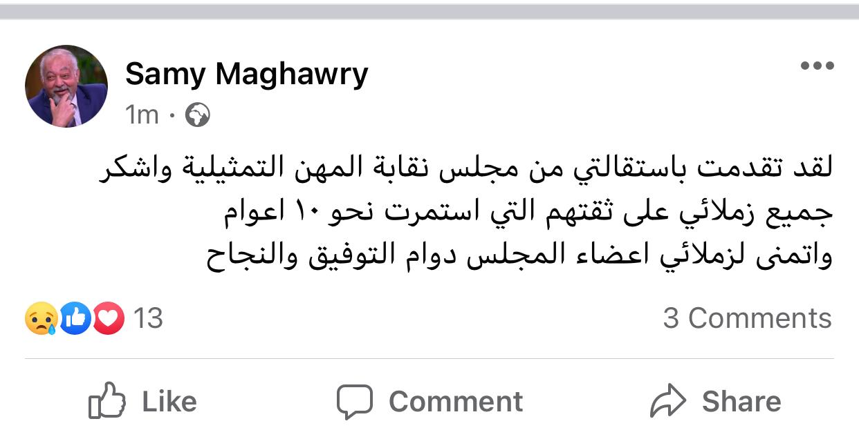 أعلن الفنان سامى مغاورى، استقالته من مجلس نقابة المهن التمثيلية بشكل مفاجئ حيث كتب على حسابه الشخصى بموقع التواصل الاجتماعى فيس بوك: "لقد تقدمت باستقالتي من مجلس نقابة المهن التمثيلية وأشكر جميع زملائي على ثقتهم التي استمرت نحو 10 أعوام وأتمنى لزملائي أعضاء المجلس دوام التوفيق والنجاح.
