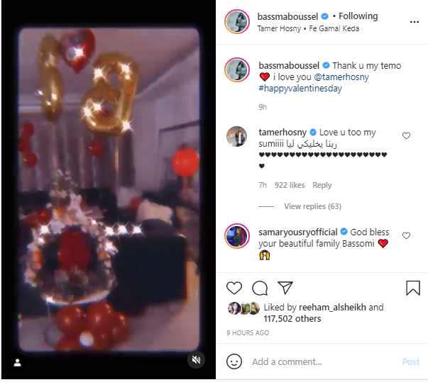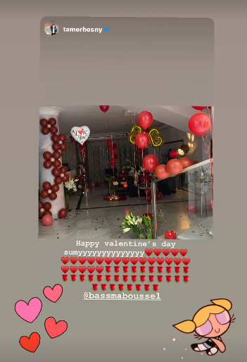 وحرص النجم تامر حسني، على تزيين المنزل بالورود والبلالين الحمراء ليحتفل مع زوجته بمناسبة الفلانتين، فيما علقت بسمة، على الفيديو الذي نشرته عبر استورى حسابها على انستجرام: "شكرا يا تيمو.. بحبك"، ورد عليها تامر حسني في التعليقات قائلا: "ربنا يخليكى ليا".