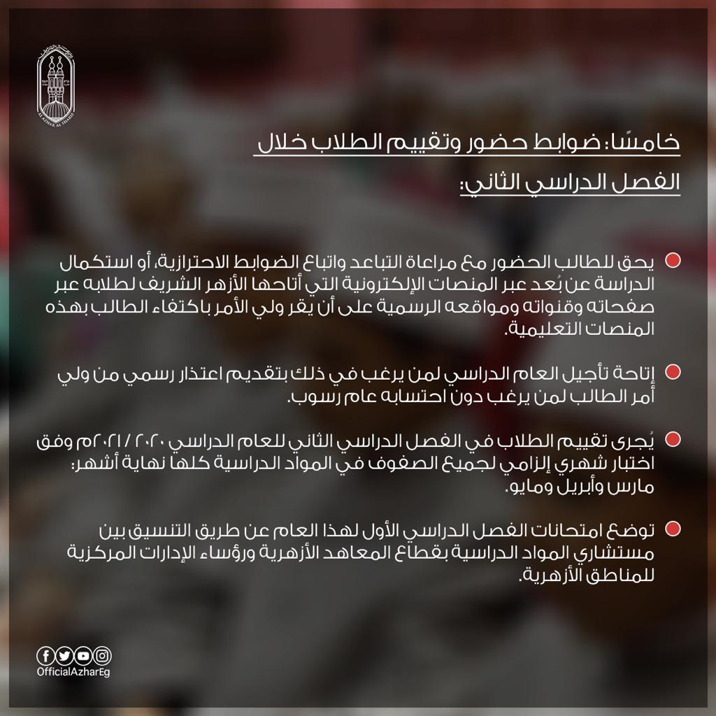 1) يحق للطالب الحضور مع مراعاة التباعد واتباع الضوابط الاحترازية، أو استكمال الدراسة عن بُعد عبر المنصات الإلكترونية التي أتاحها الأزهر الشريف لطلابه عبر صفحاته وقنواته ومواقعه الرسمية على أن يقر ولي الأمر باكتفاء الطالب بهذه المنصات التعليمية.