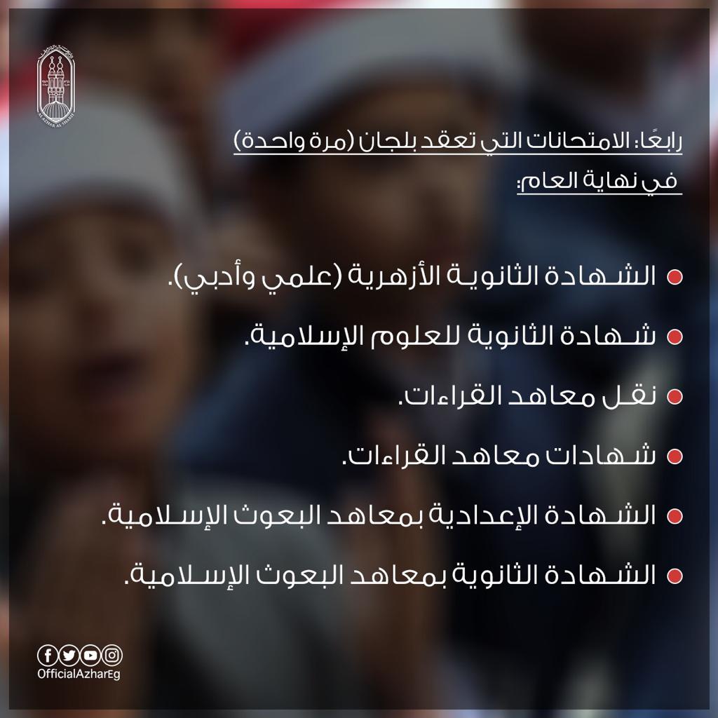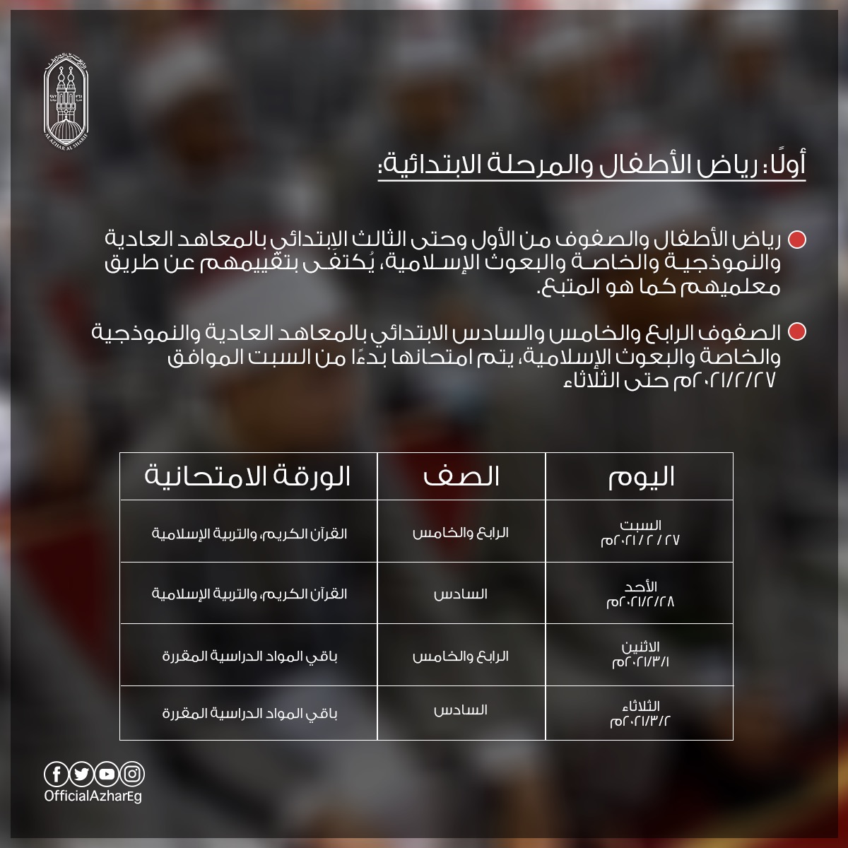 2- الصفوف الرابع والخامس والسادس الابتدائي بالمعاهد العادية والنموذجية والخاصة والبعوث الإسلامية، يتم امتحانها بدءًا من السبت الموافق 27/2/2021م حتى الثلاثاء الموافق 2/3/2021م، على أن يؤدي طلاب الفرقتين الرابع والخامس الابتدائي امتحان القرآن الكريم، والتربية الإسلامية يوم السبت الموافق 27 فبراير، وباقي المواد الدراسية المقررة يوم الاثنين 1 مارس، ويؤدي طلاب الشهادة الابتدائية القرآن الكريم والتربية الإسلامية يوم الأحد 28 فبراير، وباقي المواد الدراسية المقررة يوم الثلاثاء الموافق 2 مارس 2021.