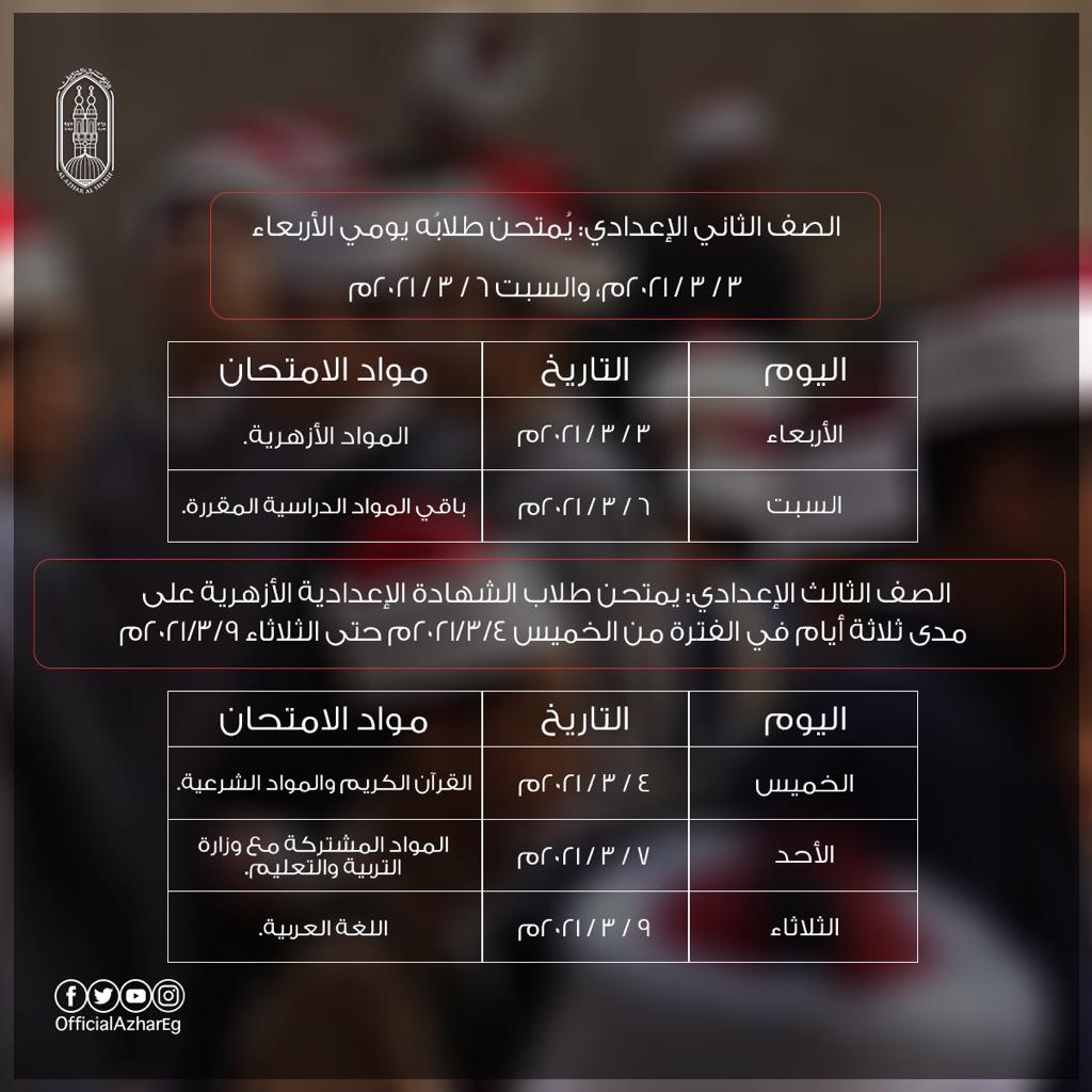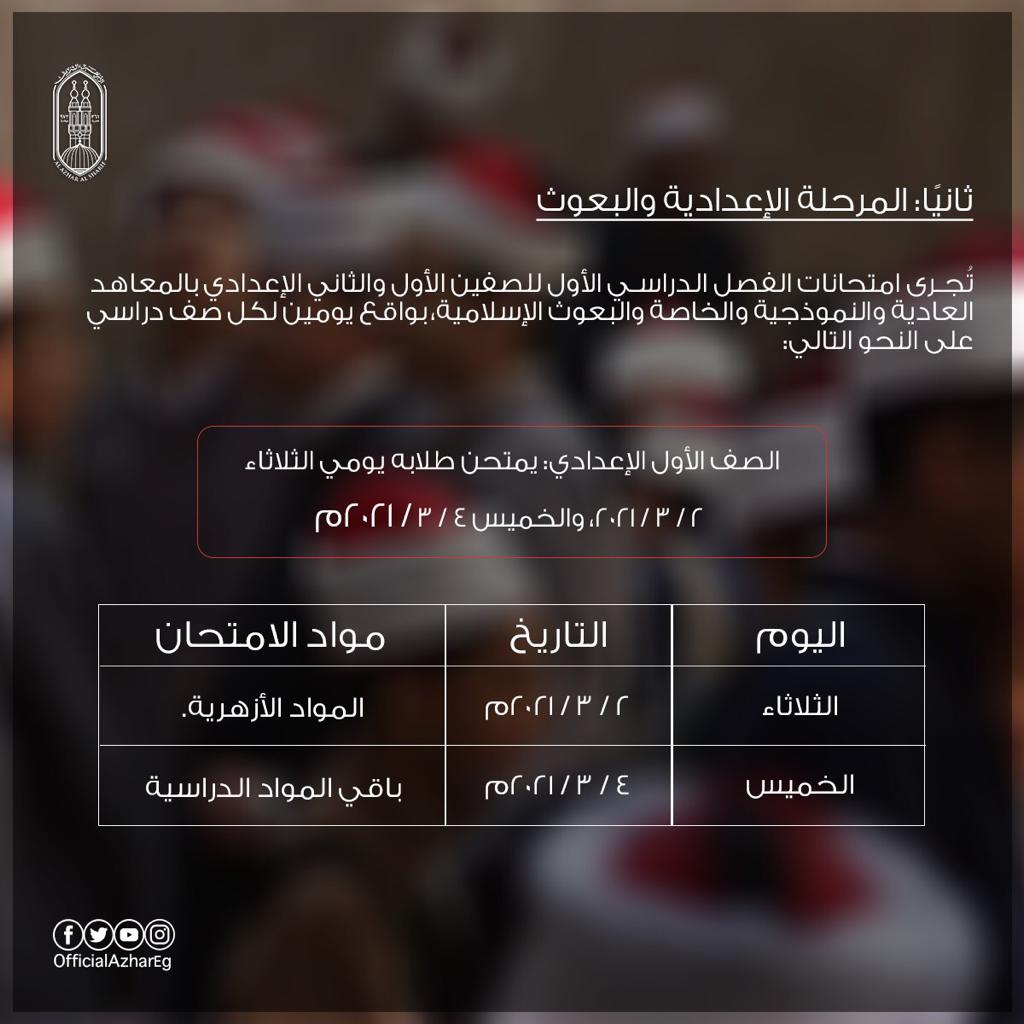 ثانيًا: المرحلة الإعدادية والبعوث الإسلامية: تُجرى امتحانات الفصل الدراسي الأول للصفين الأول والثاني الإعدادي بالمعاهد العادية والنموذجية والخاصة والبعوث الإسلامية، بواقع يومين لكل صف دراسي، على أن يؤدي طلاب الصف الأول الإعدادي امتحان المواد الأزهرية (القرآن الكريم والمواد العربية والشرعية) يوم الثلاثاء 2 مارس، وباقي المواد الدراسية المقررة يوم الخميس 4 مارس، في حين يُمتحن طلاب الصف الثاني الإعدادي المواد الأزهرية يوم الأربعاء 3 مارس، وباقي المواد الدراسية المقررة يوم السبت 6 مارس، ويمتحن طلاب الشهادة الإعدادية الأزهرية على مدى ثلاثة أيام، القرآن الكريم والمواد الشرعية يوم الخميس ٤ مارس، المواد المشتركة مع وزارة التربية والتعليم يوم 7 مارس، اللغة العربية 9 مارس 2021.