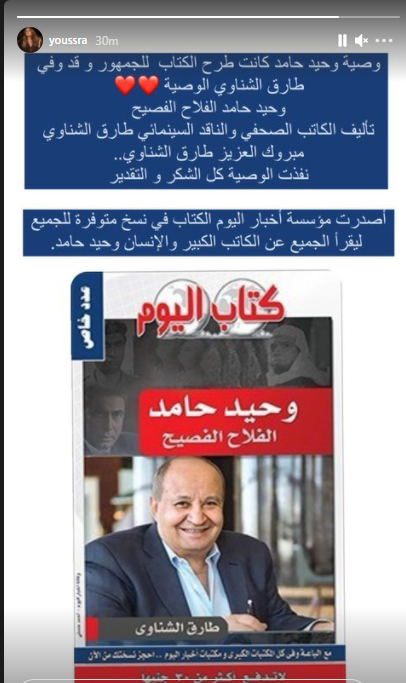 وكتبت يسرا في استوري نشرته عبر حسابها الشخصى بموقع انستجرام: "وصية وحيد حامد كانت طرح الكتاب للجمهور وقد وفي طارق الشناوي الوصية، وحيد حامد الفلاح الفصيح، تأليف الكاتب الصحفي والناقد السينمائي طارق الشناوي، مبروك العزير طارق الشناوي، نفذت الوصية، كل الشكر والتقدير".