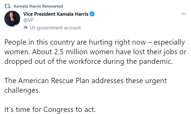 وغردت كامالا هاريس، نائب بايدن، على حسابها الرسمي بموقع "تويتر"، قائلة: "الناس في هذا البلد يتأذون الآن - وخاصة النساء. فقدت حوالي 2.5 مليون امرأة وظائفهن أو تسربن من القوى العاملة أثناء الوباء.