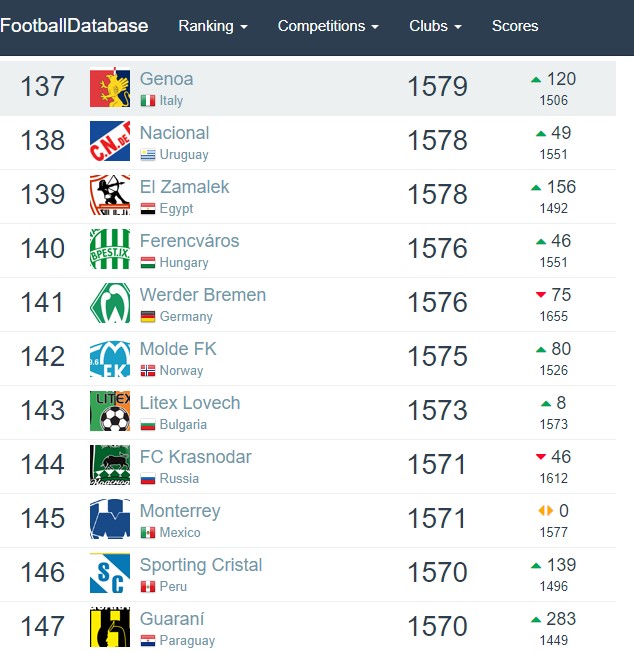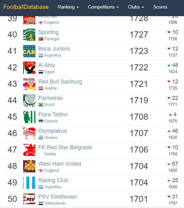 كشف موقع "footballdatabase" أن النادى الأهلى جاء فى المركز الـ 42 عالميا برصيد 1772 نقطة متفوقاً على بالميراس البرازيلى وأولمبياكوس اليونانى وفالنسيا الإسبانى ووست هام يونايتد وأستون فيلا الإنجليزى.
