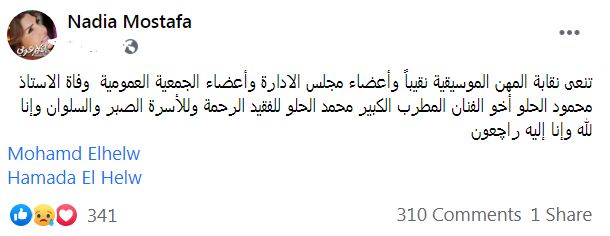 أعلنت المطربة نادية مصطفى، عضو مجلس نقابة المهن الموسيقية، وفاة محمود الحلو شقيق المطرب الكبير محمد الحلو، وكتبت نادية مصطفى على صفحتها الشخصية على موقع "فيس بوك"، "تنعى نقابة المهن الموسيقية نقيباً وأعضاء مجلس الادارة وأعضاء الجمعية العمومية وفاة الاستاذ محمود الحلو أخو الفنان المطرب الكبير محمد الحلو.. للفقيد الرحمة وللأسرة الصبر والسلوان وإنا لله وإنا إليه راجعون".