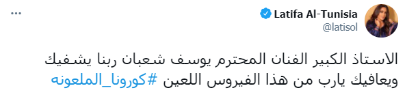 أعربت النجمة التونسية لطيفة عن تمنياتها بالشفاء العاجل للفنان القدير يوسف شعبان، الذى نقل إلى المستشفى، اليوم الثلاثاء، بعد إصابته بفيروس كورونا "كوفيد - 19"، وكتبت لطيفة، عبر حسابها على تويتر: "الأستاذ الكبير الفنان المحترم يوسف شعبان ربنا يشفيك ويعافيك يا رب من هذا الفيروس اللعين.. كورونا الملعونة".