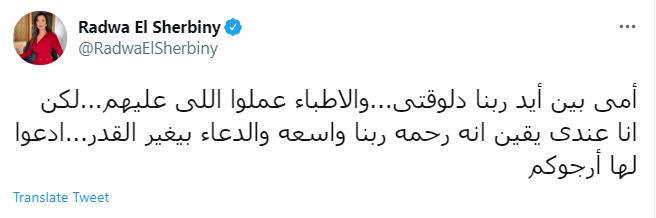 أكدت الإعلامية رضوى الشربيني، أن حالة والدتها الصحية حرجة، موضحة أن الأطباء المعالجين لها بذلوا مجهودا كبيرا في التعامل مع حالتها، وغردت رضوى الشربيني على حسابها الرسمي بموقع "تويتر"، قائلة : " أمى بين ايد ربنا دلوقتى.. والأطباء عملوا اللى عليهم.. لكن أنا عندى يقين انه رحمه ربنا واسعة والدعاء بيغير القدر.. ادعوا لها أرجوكم".