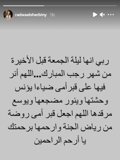 وقالت رضوى، فى دعائها لوالدتها، الذى نشرته عبر ستورى حسابها على انستجرام: "ربى أنها ليلة الجمعة قبل الأخيرة من شهر رجب المبارك، اللهم أنر فيها على قبر أمى ضياءً يؤنس وحشتها وينور مضجعها ويوسع مرقدها، اللهم اجعل على قبر أمى روضة من رياض الجنة وارحمها برحمتك يا أرحم الراحمين".