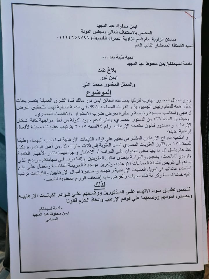 وطالب محفوظ في ختام بلاغه الذي حمل رقم 12453 لسنه2019 عرائض النائب العام بتطبيق مواد الاتهام علي المذكورين ووضعهم علي قوائم الكيانات الارهابيه ومصادره اموالهم ووضعهما علي قوائم الترقب واتخاذ اللازم قانونا.