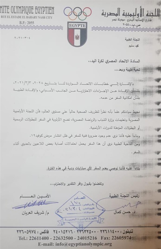 من جانبه أكد نبيل خشة أمين صندوق الاتحاد ان مجلس الإدارة تلقى منذ قليل خطاب من اللجنة الطبية التابعة للجنة الاولمبية وكذلك من مسئول الاولمبية بعدم السماح بسفر الفراعنة لاسبانيا.