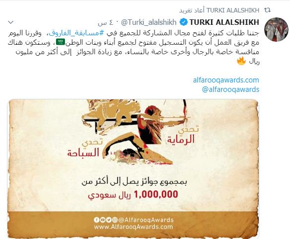 وكتب «آل الشيخ»، تغريدة على حسابه الرسمى على تويتر" جاءتنا طلبات كثيرة لفتح مجال المشاركة للجميع في #مسابقة_الفاروق، وقررنا اليوم مع فريق العمل أن يكون التسجيل مفتوحًا لجميع أبناء وبنات الوطن.