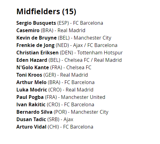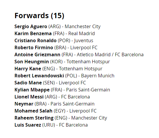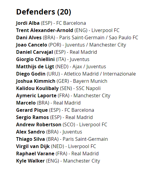 وضمت قائمة حراس المرمى كلاً من: أوبلاك حارس أتلتيكو مدريد الإسبانى، وأليسون حارس ليفربول الإنجليزي، ودافيد دى خيا حارس مانشستر يونايتد الإنجليزى، وشتيجن حارس برشلونة الإسبانى، وإيدرسون حارس مانشستر يونايتد الإنجليزى.