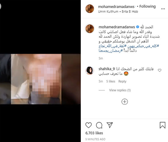 وكتب رمضان في تعليقه عبر حسابه على "إنستجرام": "الحمد لله وقدر الله وما شاء فعل.. إصابتى كانت شديدة أثناء تصوير النهاردة، لكن الحمد لله الأهم إن الشغل يوصلكم حقيقى وكله فى حبكم يهون"، ثم ختم كلامه بعبارته الشهيرة "ثقة في الله نجاح.. ودائمًا أبدًا رمضان يجمعنا".