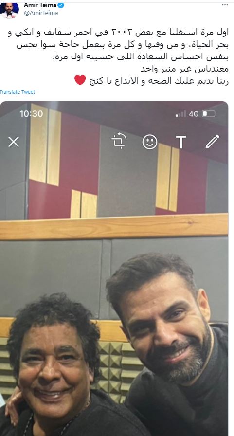 وشارك أمير طعيمة جمهوره عبر موقع التواصل الاجتماعي "تويتر" صورة تجمعه بالكينج محمد منير، معلقا: "أول مرة اشتغلنا مع بعض عام 2003 في أحمر شفايف وابكي وبحر الحياة، ومن وقتها وكل مرة بنعمل حاجة سوا بحس بنفس إحساس السعادة اللي حسيته أول مرة.. معندناش غير منير واحد ربنا يديم عليك الصحة والإبداع يا كنج".