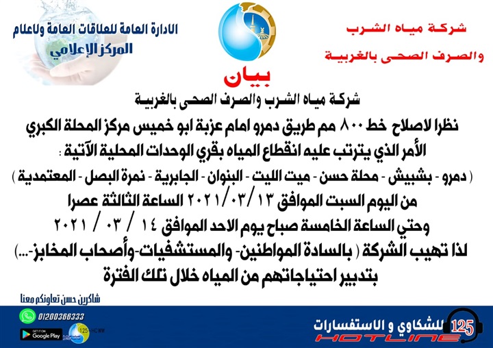 وأرجعت الشركة سبب الانقطاع للقيام بأعمال الإصلاح لخط 800 مم بطريق دمرو أمام عزبة خميس مركز المحلة الكبرى، بأصحاب المخابز والمستشفيات بتدبير احتياجاتهم من المياه خلال الفترة المذكورة.