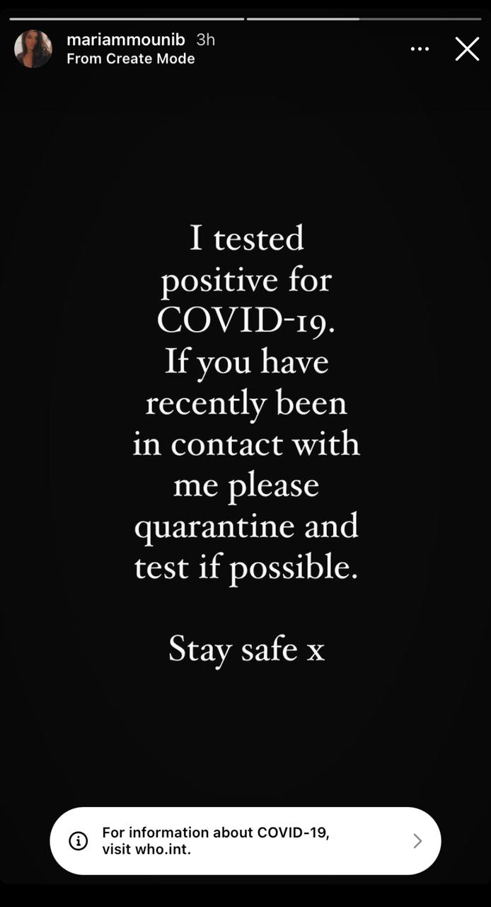 أعلنت المطربة الشابة مريم عامر منيب، ابنة المطرب الراحل عامر منيب، إصابتها بفيروس كورونا، عبر خاصية ستورى على حسابها على إنستجرام، وكتبت مريم، قائلة: "إيجابي كورونا، كل المتعاملين معايا خلال الفترة الماضية إجراء تحليل فيروس كورونا".