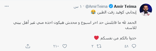 وكتب في تغريدته قائلاً : " إيجابي كوفيد، الحمد لله ما قابلتش حد أخر اسبوع ومحدش هيكون أخذه مني غير أهل بيتي للأسف، خدوا بالكم من نفسكم".