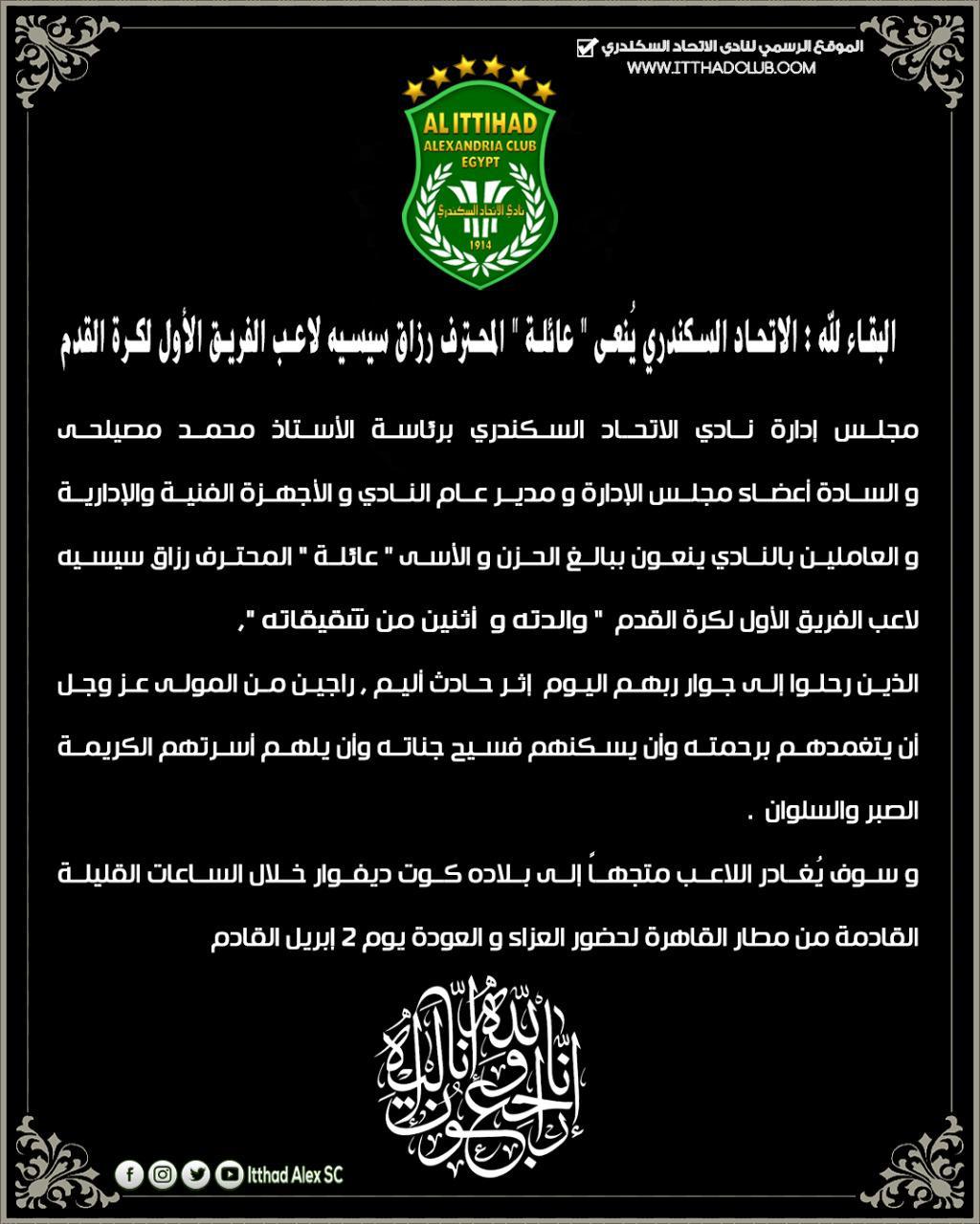 نعى مجلس إدارة نادى الإتحاد السكندرى برئاسة محمد مصيلحى عائلة المحترف رزاق سيسيه لاعب الفريق الأول لكرة القدم فى ظل وفاة والدته و أثنين من شقيقاته أثر حادث أليم.