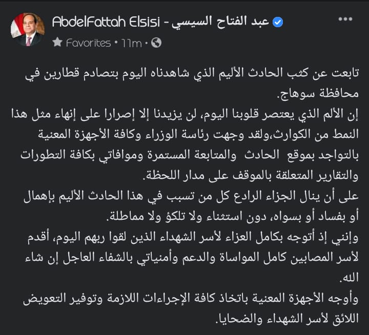 وقال الرئيس السيسى عبر صفحته الرسمية "فيس بوك": "تابعت عن كثب الحادث الأليم الذى عايناه اليوم بتصادم قطارين فى محافظة سوهاج، إن الألم الذى يعتصر قلوبنا اليوم، لن يزيدنا إلا إصرارا على إنهاء مثل هذا النمط من الكوارث، ولقد وجهت رئاسة الوزراء وكافة الأجهزة المعنية بالتواجد بموقع الحادث والمتابعة المستمرة وموافاتى بكافة التطورات والتقارير المتعلقة بالموقف على مدار اللحظة، على أن ينال الجزاء الرادع كل من تسبب فى هذا الحادث الأليم.