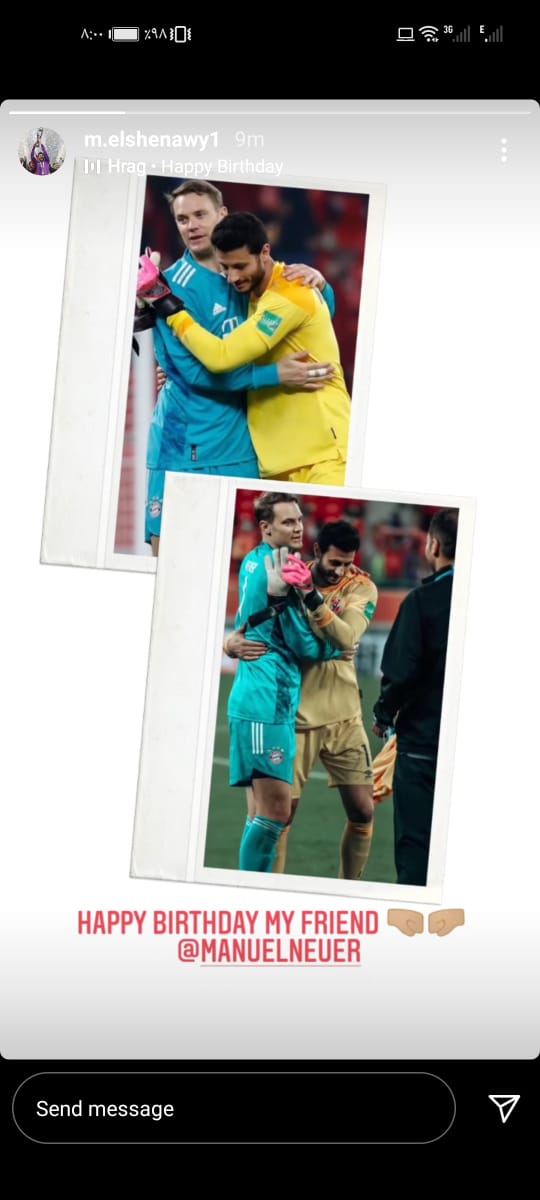 حرص محمد الشناوى، حارس مرمى النادي الأهلي ومنتخب مصر، على تهنئة مانويل نوير حارس مرمى بايرن ميونخ بعيد ميلاده رقم 35، ونشر الشناوى عبر حسابه الشخصى على إنستجرام صوراً جمعته بالنجم الألماني خلال مباراة الأهلي وبايرن ميونخ السابقة فى نصف نهائي كأس العالم للأندية، وعلق قائلا: "عيد ميلاد سعيد يا صديقي".