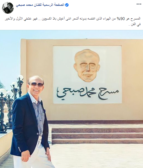 ونشر صبحى، صورة له من أمام مسرحه، صحبها بتعليق: "المسرح هو 90% من الهواء الذى أتنفسه، بدونه أشعر أننى أعيش بلا أوكسجين، فهو عشقى الأول والأخير فى الفن".