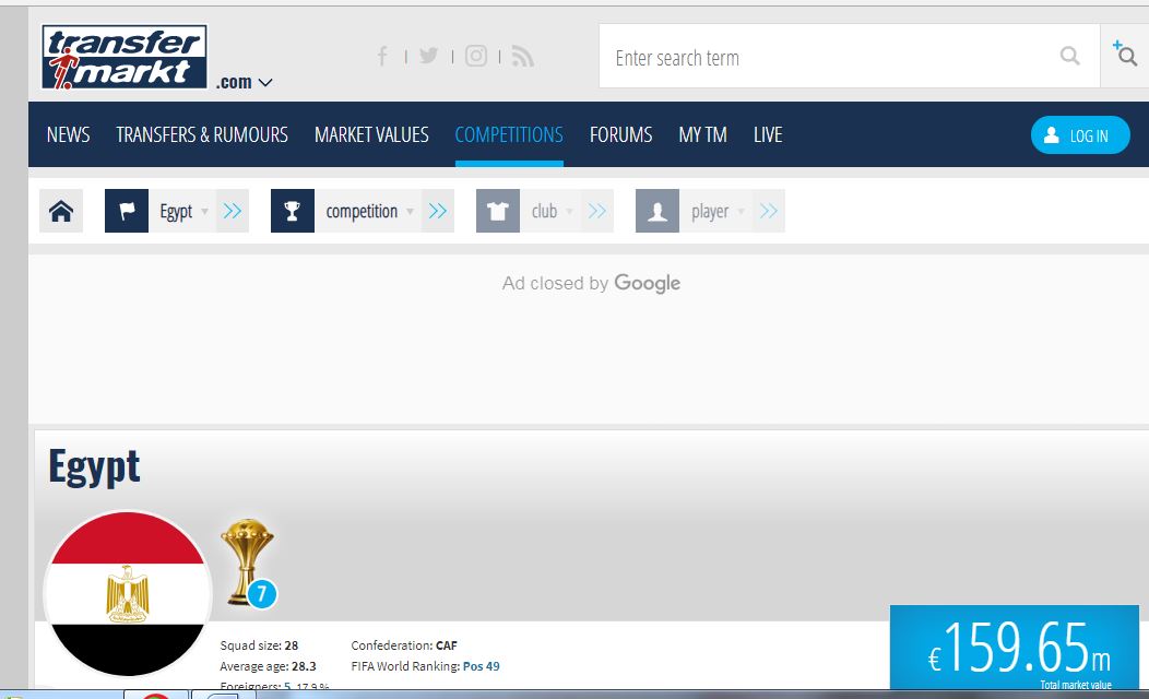 حل منتخب مصر الأول لكرة القدم فى المركز الـ30 فى ترتيب أغلى 100 منتخب بالعالم من حيث القيمة التسويقية بقيمة 159.6 مليون يورو، وذلك بحسب موقع ترانسفير ماركت المتخصص فى إحصائيات وأسعار اللاعبين.
