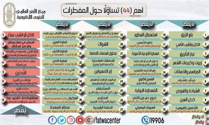 وأشار الأزهر إلى أنه يأتي رمضان وتكثُر معه أسئلة الصَّائمين حول ما يُفطر الصَّائم وما لا يُفطره، موضحًا في هذا التَّصميم الذي بين أيديكم حرص مركز الأزهر العالمي للفتوى الإلكترونية على إجابة 44 تساؤلًا فقهيًّا مُتعلقًا بالمُفطرات، من خلال عرض الفعل أو المادَّة المُتنَاوَلَة، وذكر تأثيرها على صحَّة الصَّوم عن طريق وصف هذا المذكوربـ«يُفطر» أو«لا يُفطر».
