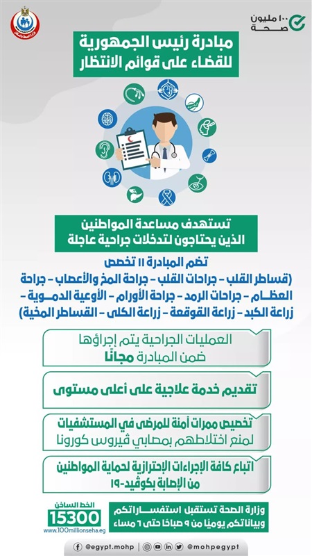 ويمكن المتابعة واستقبال الشكاوى على رقم الخط الساخن 15300. ومن جانبه أوضح الدكتور خالد مجاهد،مساعد وزيرة الصحة للإعلام والمتحدث الرسمى للوزارة، أن مبادرة رئيس الجمهورية للقضاء على قوائم الانتظار تستهدف علاج المواطنين الذين يحتاجون إلى تدخل جراحي عاجل بالمجان، مع الالتزام بكافة الإجراءات الاحترازية للوقاية من كوفيد-١٩.