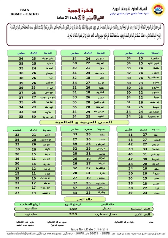 وأكدت الهيئة ظهور السحب المنخفضة على السواحل الشمالية، وأضافت أن الرياح معتدلة تنشط على السواحل الشمالية، وجنوب سيناء تكون مثيرة للرمال والأتربة على شمال الصعيد، كما تنشط على خليج السويس والبحر الأحمر مما يؤدى إلى اضطراب حركة الملاحة.