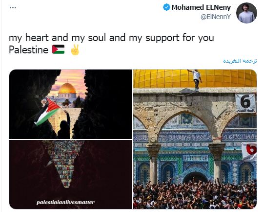تضامن النجم المصري محمد النني لاعب فريق آرسنال الإنجليزي مع الشعب الفلسطيني ضد الانتهاكات التي تمارس من قبل قوات الكيان الصهيوني خلال الأيام الأخيرة من شهر رمضان المبارك، واقتحام المسجد الأقصى وتهجير أهالي حي الشيخ جراح في القدس وتسليمه للمستوطنين.