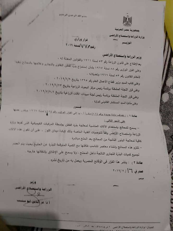 وأوضح ابوصدام أن قرار وزير الزراعة يسمح للمحالج استخدام الآلات المناسبة لعلاج بزرة القطن بواسطة المركبات الكيميائية لابادة ديدان اللوز بما يثير القلق والخوف من تلوث الكسبه التى تنتج من العصر وتستخدم فى إنتاج الأعلاف كما يلزم القرار هذه المحالج بإنشاء معاصر داخلها لعصر البذور ولايسمح على الإطلاق بانتقال البذور خارج المحالج بدون عصر مما يضر بأصحاب المعاصر الأهلية ويهدد باغلاقها.
