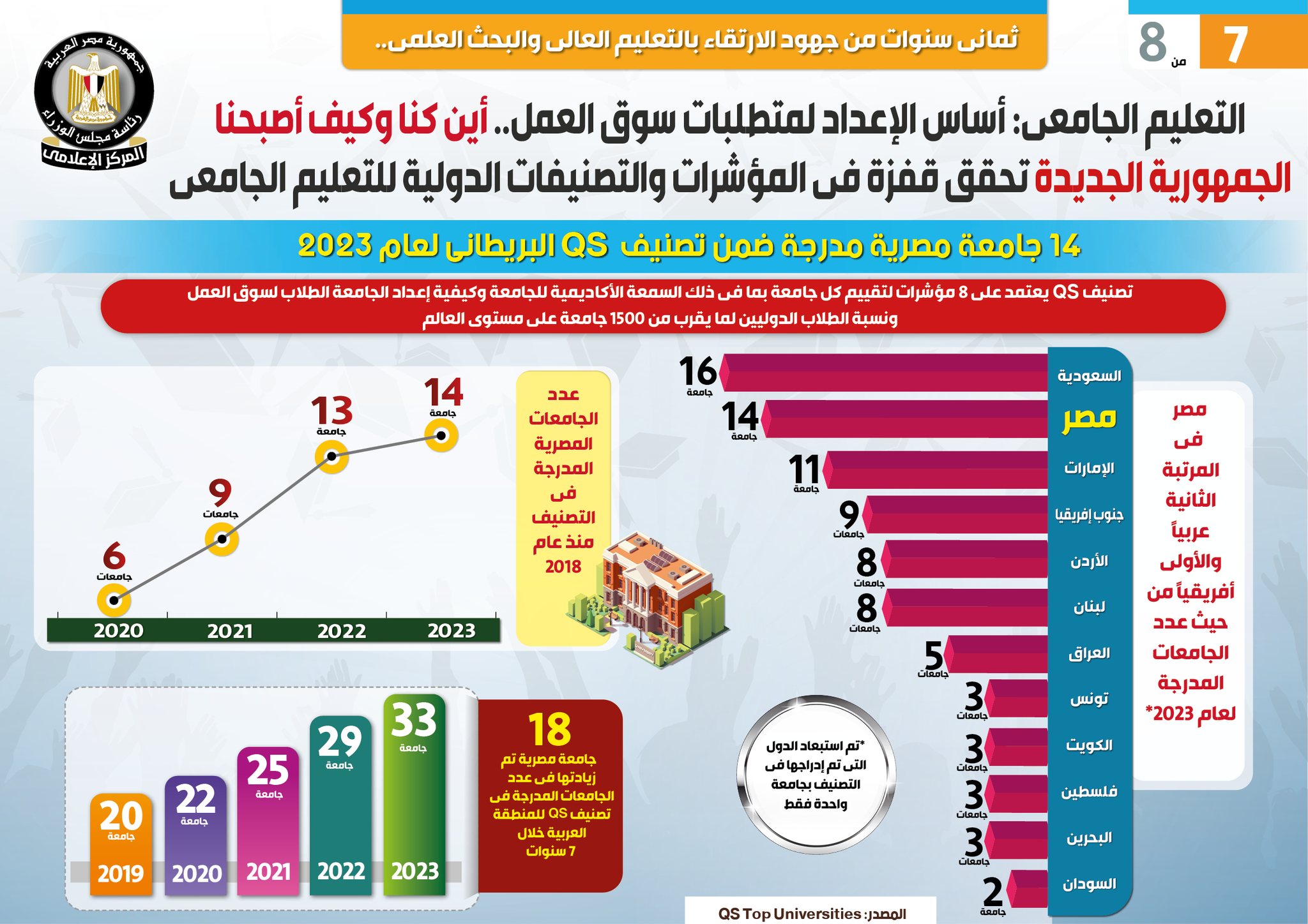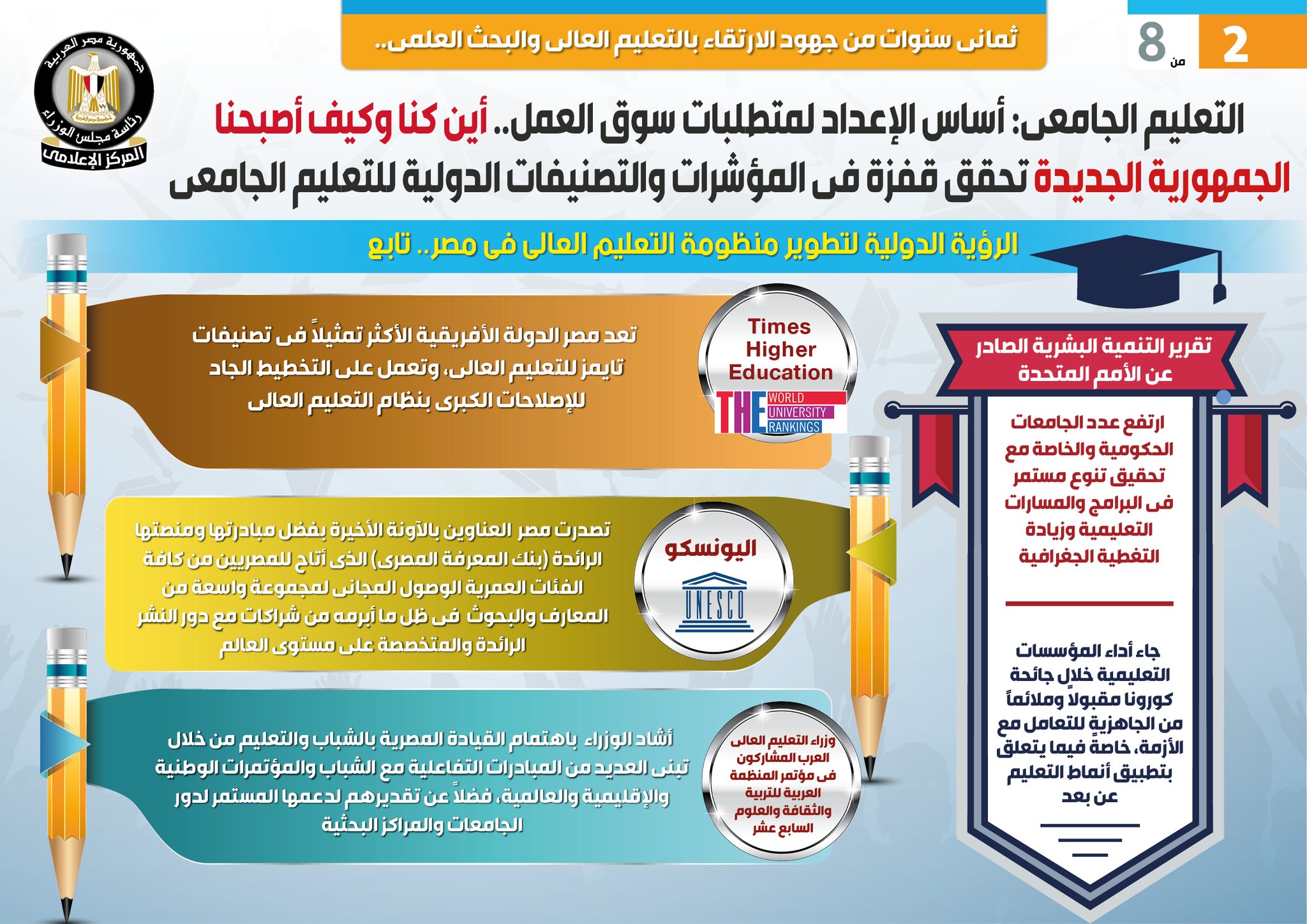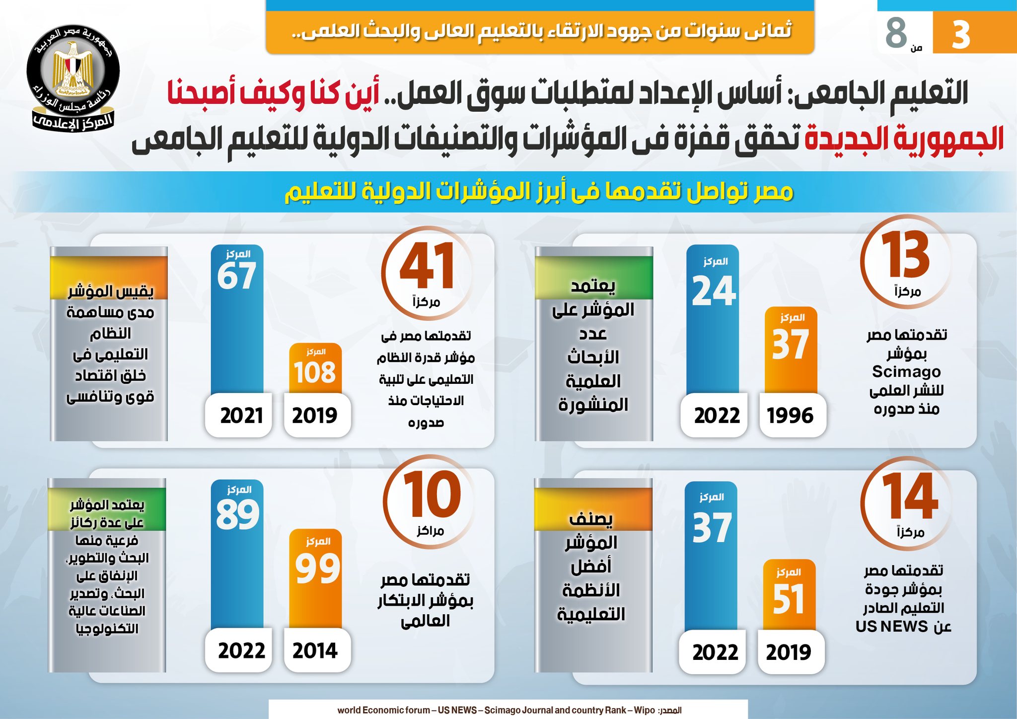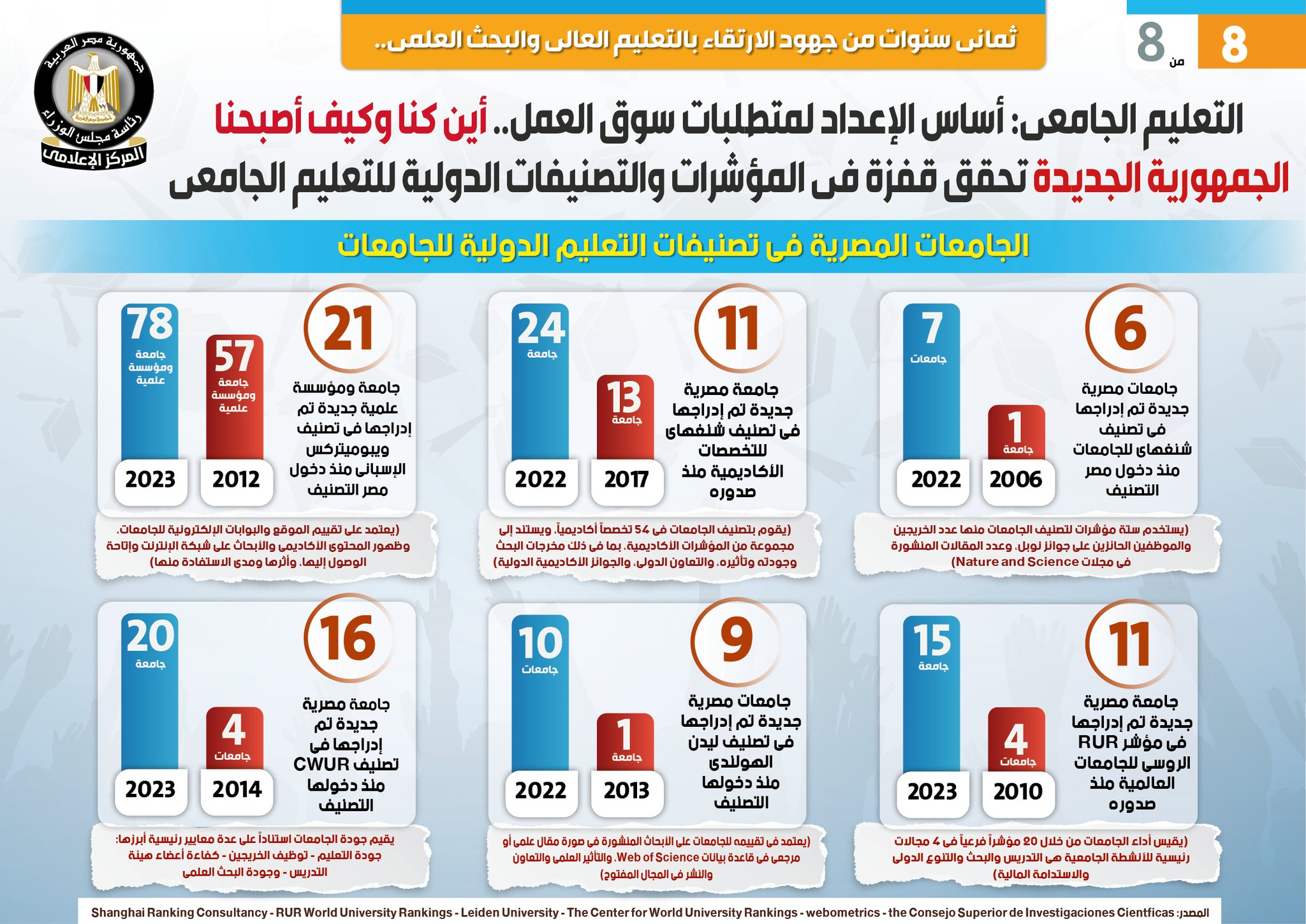 وفي هذا الصدد نشر المركز الإعلامي لمجلس الوزراء تقريراً ضمن سلسلة (أين كنا وكيف أصبحنا) يُسلط الضوء من خلال إنفوجرافات على جهود الارتقاء بالتعليم العالي والبحث العلمي خلال ثماني سنوات، والقفزة التي حققتها الجمهورية الجديدة في المؤشرات والتصنيفات الدولية للتعليم الجامعي، وذلك باعتباره أساس الإعداد لمتطلبات سوق العمل.