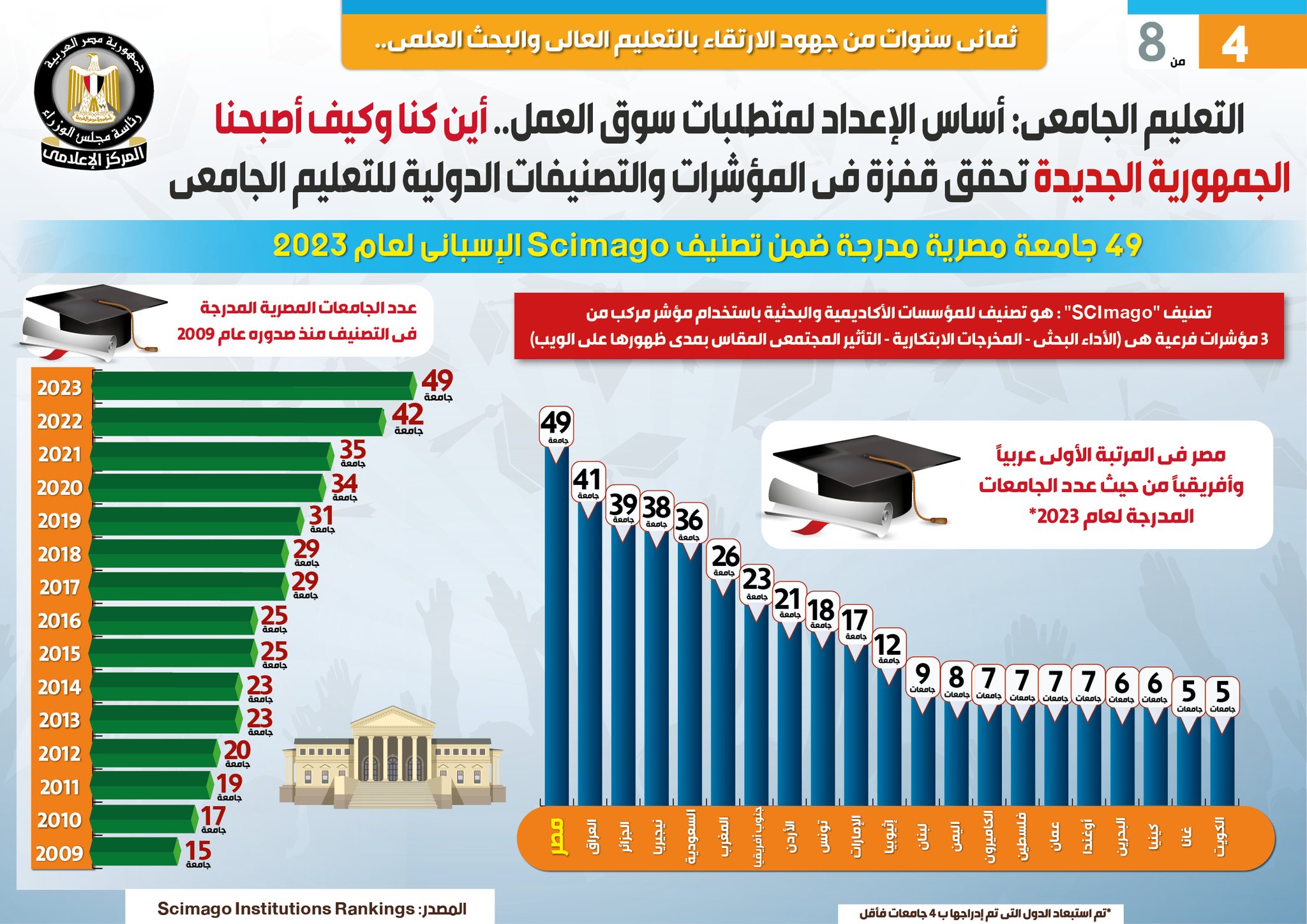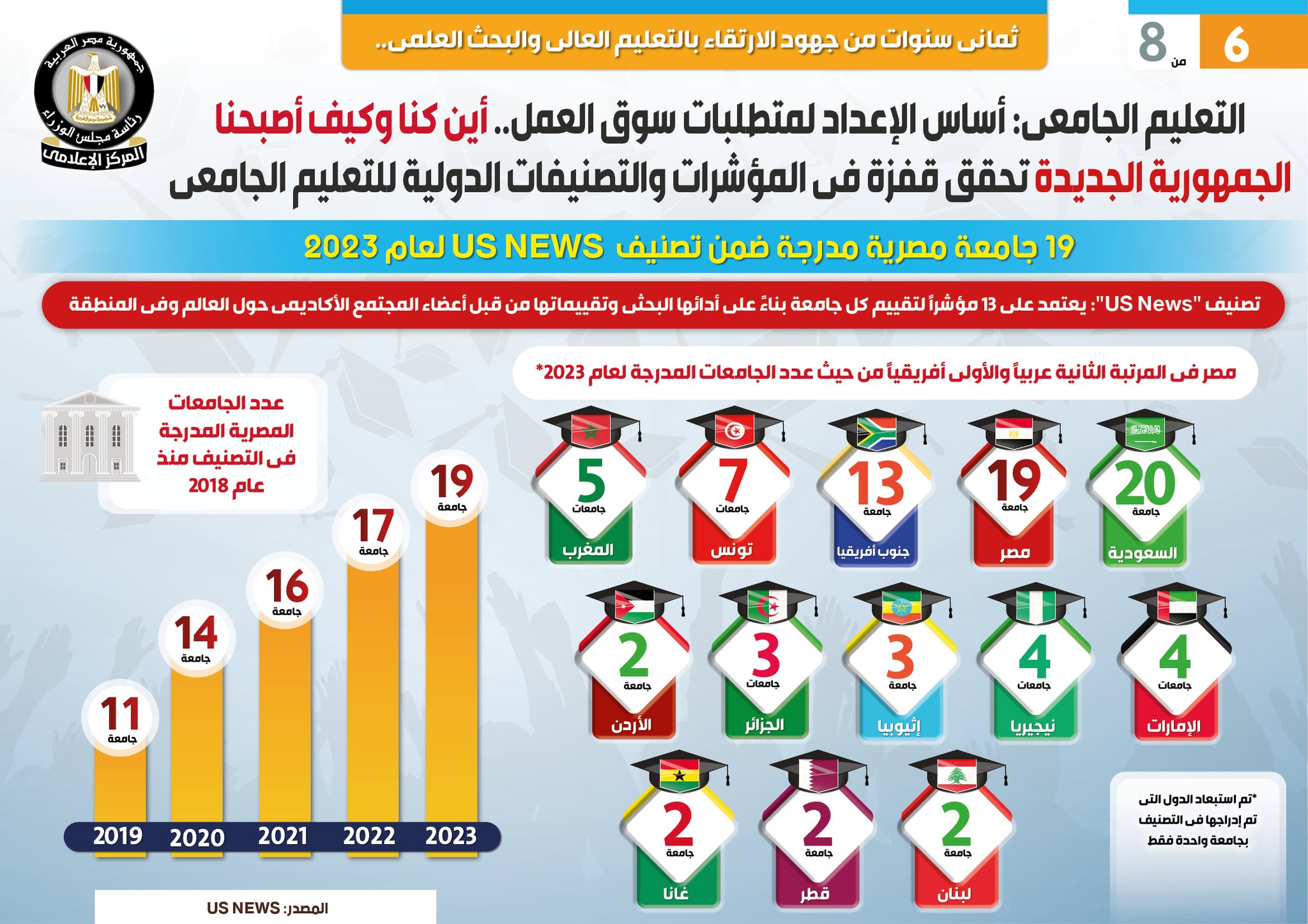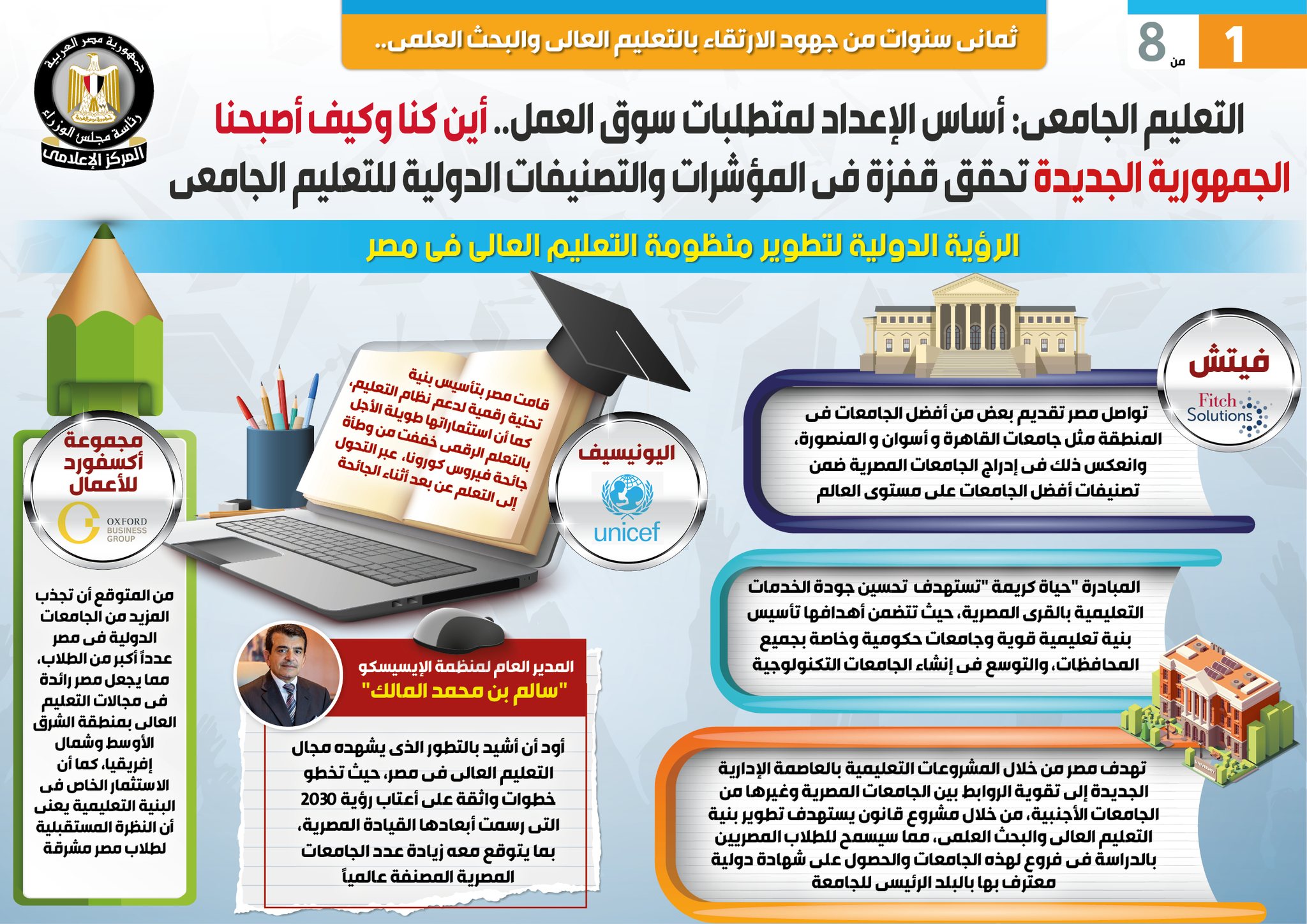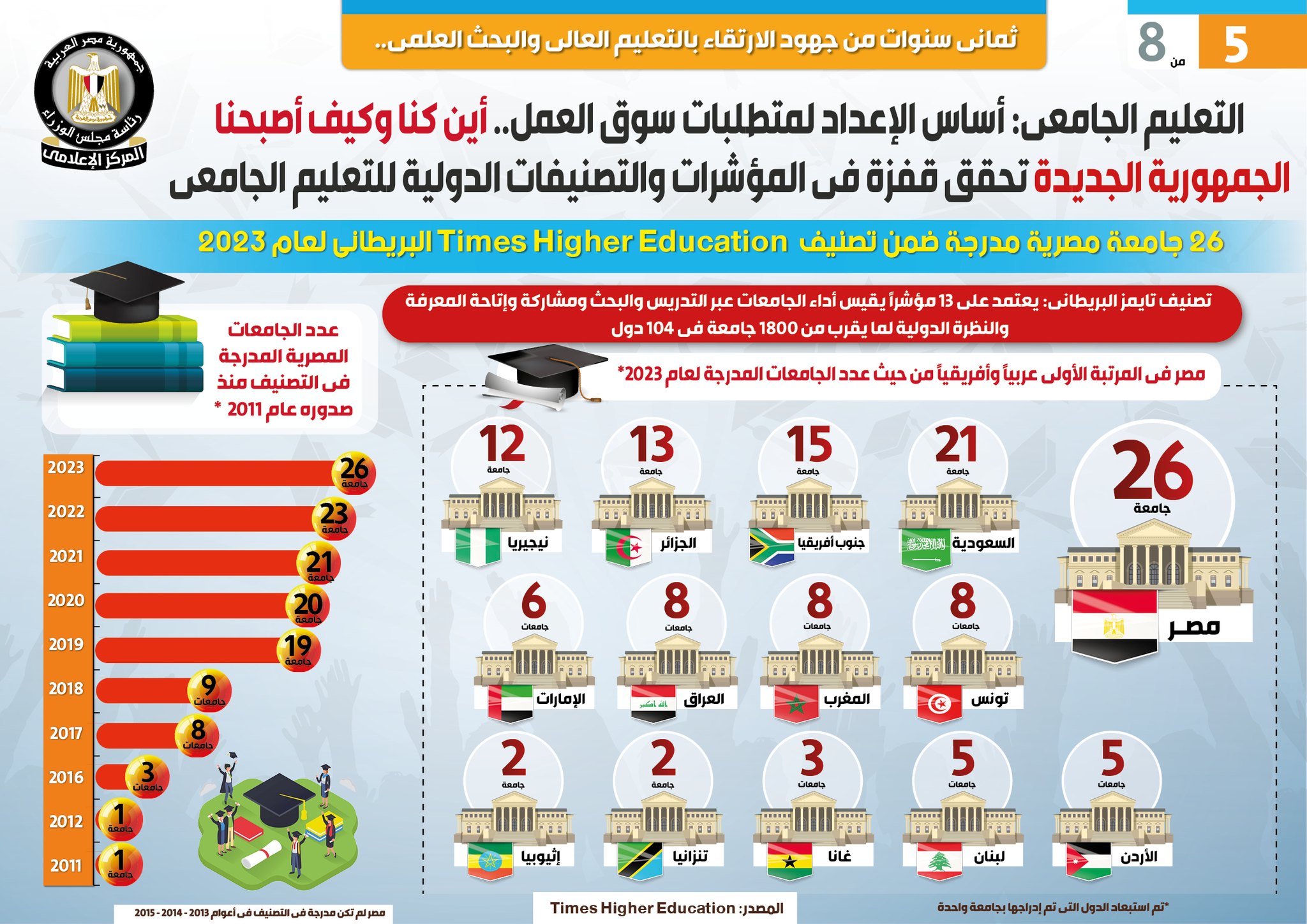 وفي هذا الصدد نشر المركز الإعلامي لمجلس الوزراء تقريراً ضمن سلسلة (أين كنا وكيف أصبحنا) يُسلط الضوء من خلال إنفوجرافات على جهود الارتقاء بالتعليم العالي والبحث العلمي خلال ثماني سنوات، والقفزة التي حققتها الجمهورية الجديدة في المؤشرات والتصنيفات الدولية للتعليم الجامعي، وذلك باعتباره أساس الإعداد لمتطلبات سوق العمل.