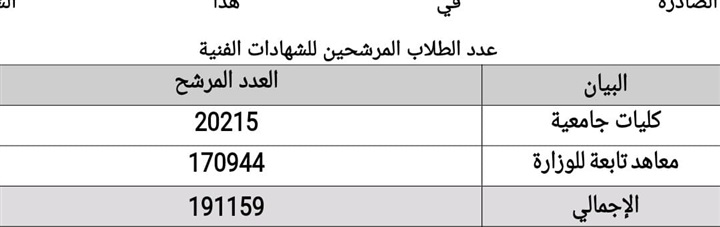 وأشارت الوزارة إلى انه قد تبين وجود زيادة في أعداد المتقدمين من خريجي الشهادات الفنية نظام 3- 5 سنوات والمعاهد المتوسطة نظام السنتين لهذا العام 2019 عن العام الماضي بنحو 17000 طالب وطالبة.