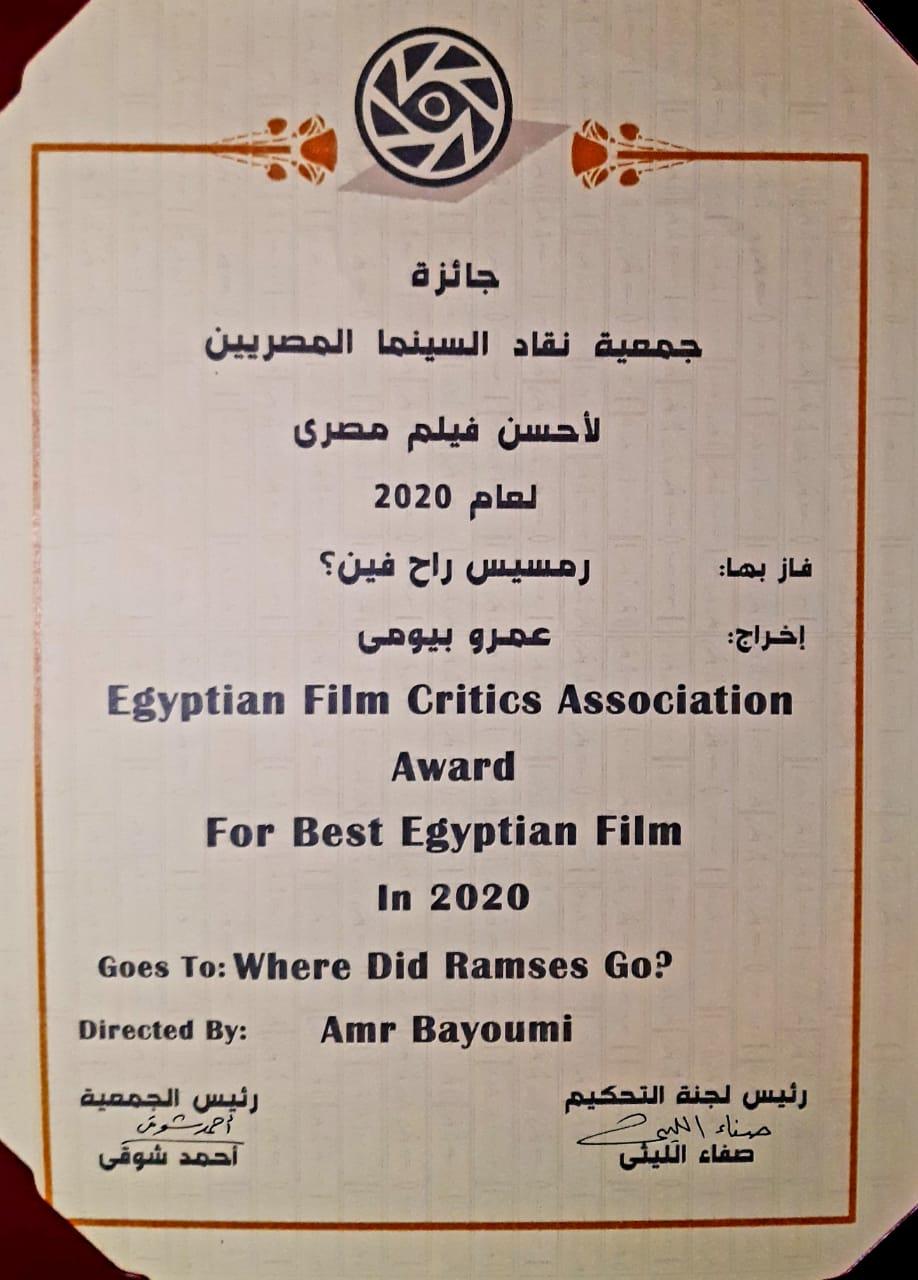 أقامت أمس جمعية نقاد السينما المصريين بمقرها إحتفالية خاص لتسليم المخرج عمرو بيومى جائزة أحسن فيلم مصرى لعام 2020 عن فيلمه التسجيلى الطويل "رمسيس راح فين" .