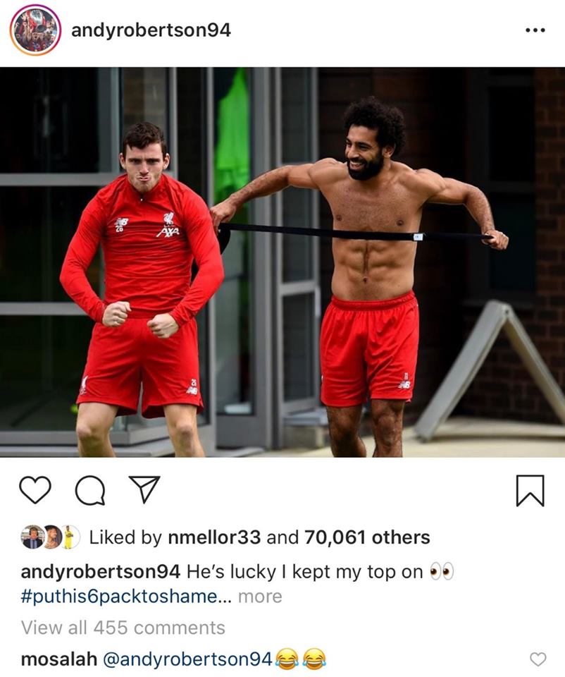 تفاعل الدولى المصرى محمد صلاح لاعب ليفربول الانجليزى مع زميله أندى روبرتسون عبر حساب الأخير بموقع التواصل الاجتماعي الشهير "انسجرام".