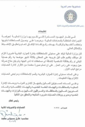 وأوضح منشور وزارة المالية أنه يجب على المسئولين الماليين بالجهاز الإداري للدولة ووحدات الإدارة المحلية بالمحافظات والهيئات العامة الخدمية والهيئات الاقتصادية والمديرين الماليين بالمحافظات والمراقبين الماليين بالوزارات والهيئات الخدمية ومديري ووكلاء الحسابات متابعة وتحقق من التنفيذ.