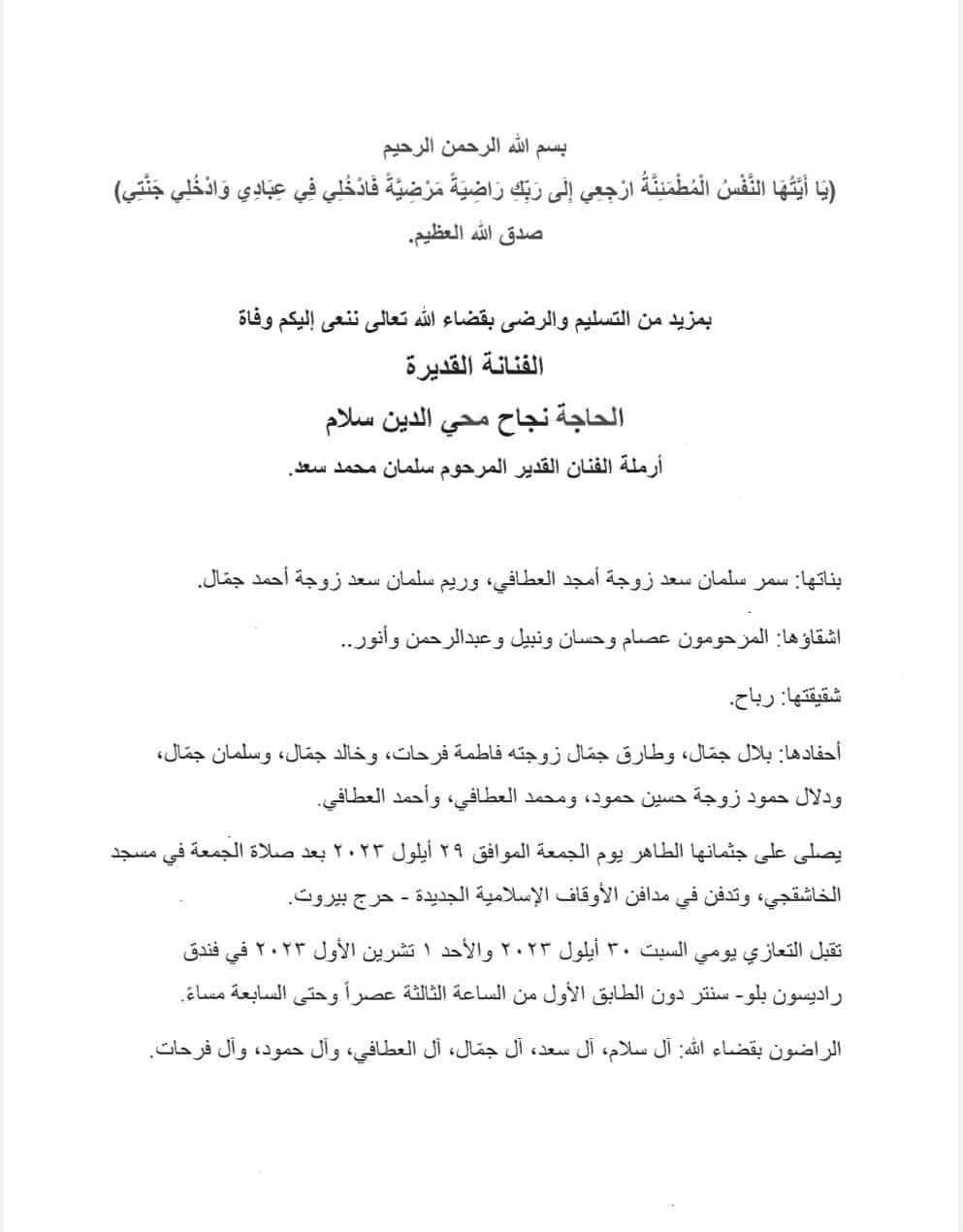 وقالت سمر العطافى ان صلاة الجنازة ستكون غدا الجمعة الموافق 29 سبتمبر 2023 من مسجد الخاشقجى ، وأن جسمان الفقيدة سيوارى التراب فى مدافن الأوقاف الإسلامية الجديدة بالعاصمة اللبنانية بيروت .