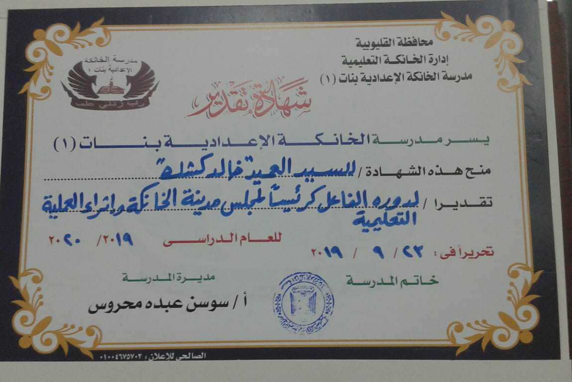 كرمت المدرسة الإعدادية بنات بالخانكة العميد خالدكشك رئيس المركز ونائبه الاستاذ طلال ربيع تقديرا لجهودها في تأهيل المدارس للعام الدراسي الجديد