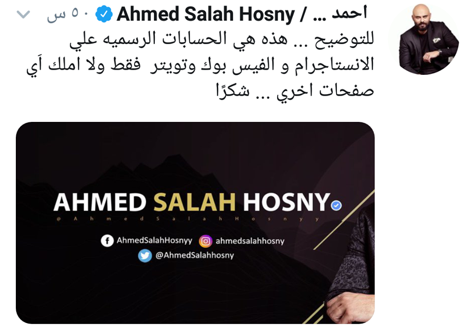 حذر الفنان أحمد صلاح حسني من الحسابات الإليكترونية التي تنتحل شخصيته، ونشر أحمد صلاح عبر حسابه بموقع «تويتر» صورة لحساباته الأخرى بمواقع التواصل الاجتماعي.