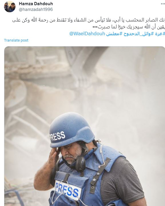 نشر حمزة نجل وائل الدحدوح قبل ساعات من استشهاده عبر حسابه على منصة إكس: إنك الصابر المحتسب يا أبي، فلا تيأس من الشفاء ولا تقنط من رحمة الله وكن على يقين أن الله سيجزيك خيرًا لما صبرت.