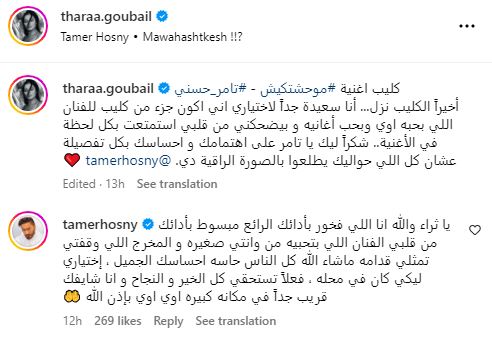 ورد تامر حسني على ثراء جبيل قائلا: "يا ثراء والله أنا اللى فخور بأدائك الرائع مبسوط بأدائك من قلبى الفنان اللى بتحبيه من وإنتى صغيرة".