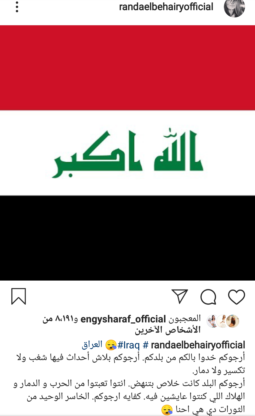 ونشرت راندا البحيري عبر حساب "انستجرام" صورة علم العراق وعلقت عليها:"أرجوكم خدوا بالكم من بلدكم، أرجوكم بلاش أحداث فيها شغب ولا تكسير ولا دمار".