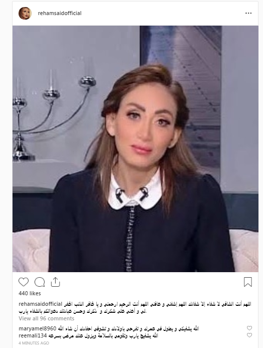 نشرت ريهام السعيد، صورة لنفسها عبر حسابها على "انستجرام"، مرفقة بدعاء: " اللهم أنت الشافي لا شفاء إلا شفائك اللهم اشفني وعافني اللهم أنت الرحيم ارحمني و يا غافر الذنب اغفر لي وأعنى على شكرك وذكرك وحسن عبادتك"، مطالبه جمهورها بالدعاء لها قائلة: " دعواتكم بالشفاء يارب".