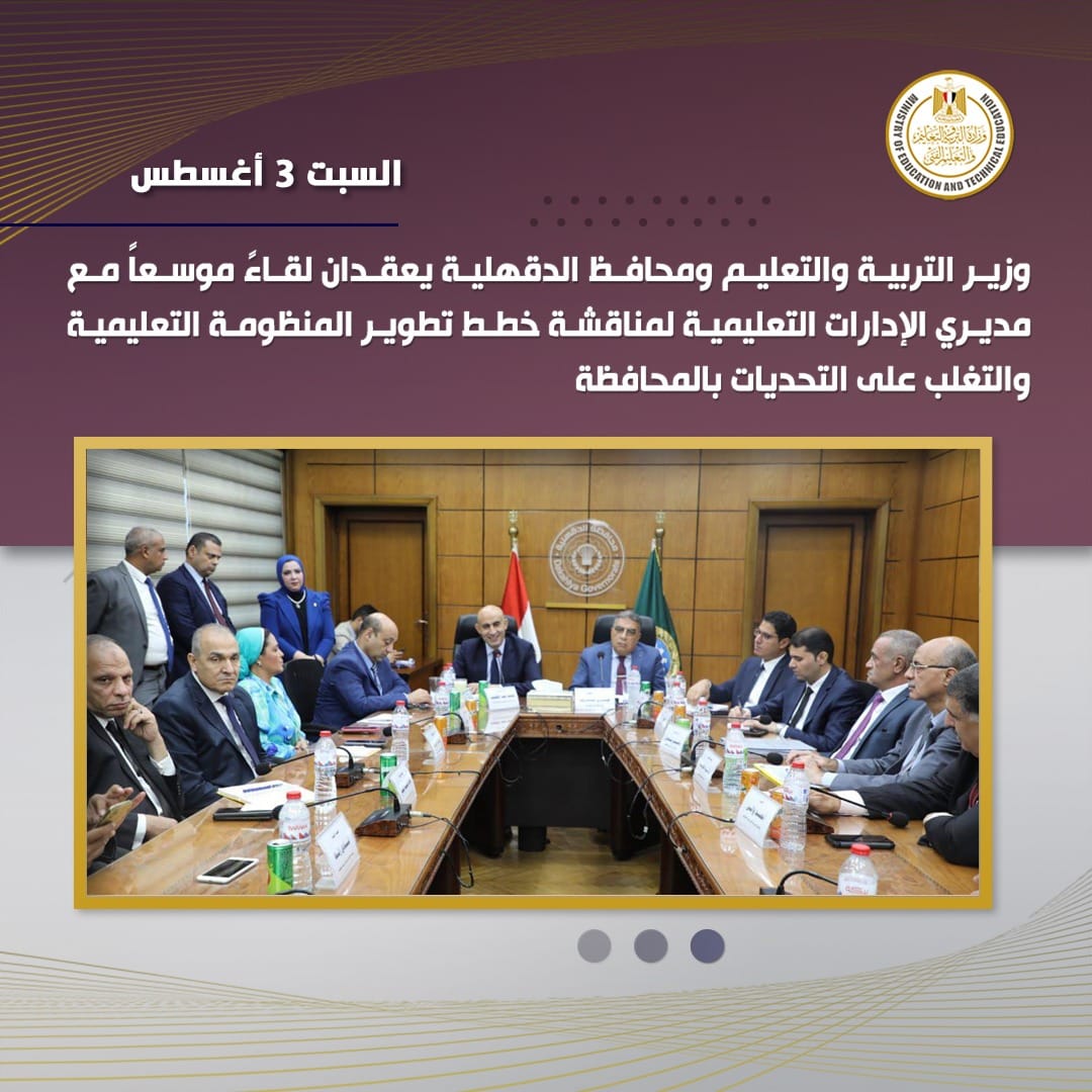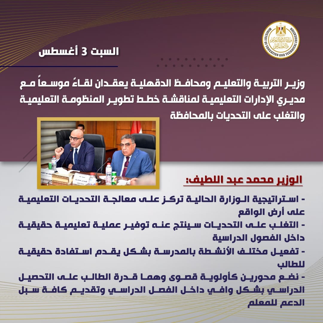 عقد السيد/ محمد عبد اللطيف وزير التربية والتعليم والتعليم الفنى واللواء طارق مرزوق محافظ الدقهلية، لقاءًا مع عدد من قيادات الوزارة، ومديري ووكلاء الإدارات التعليمية بالمحافظة؛ لمناقشة القضايا والمشكلات والخطط المستقبلية لتطوير المنظومة التعليمية في المحافظة، فضلا عن بحث كافة المقترحات المتعلقة بسبل مواجهة الكثافات الطلابية وعجز المعلمين.
