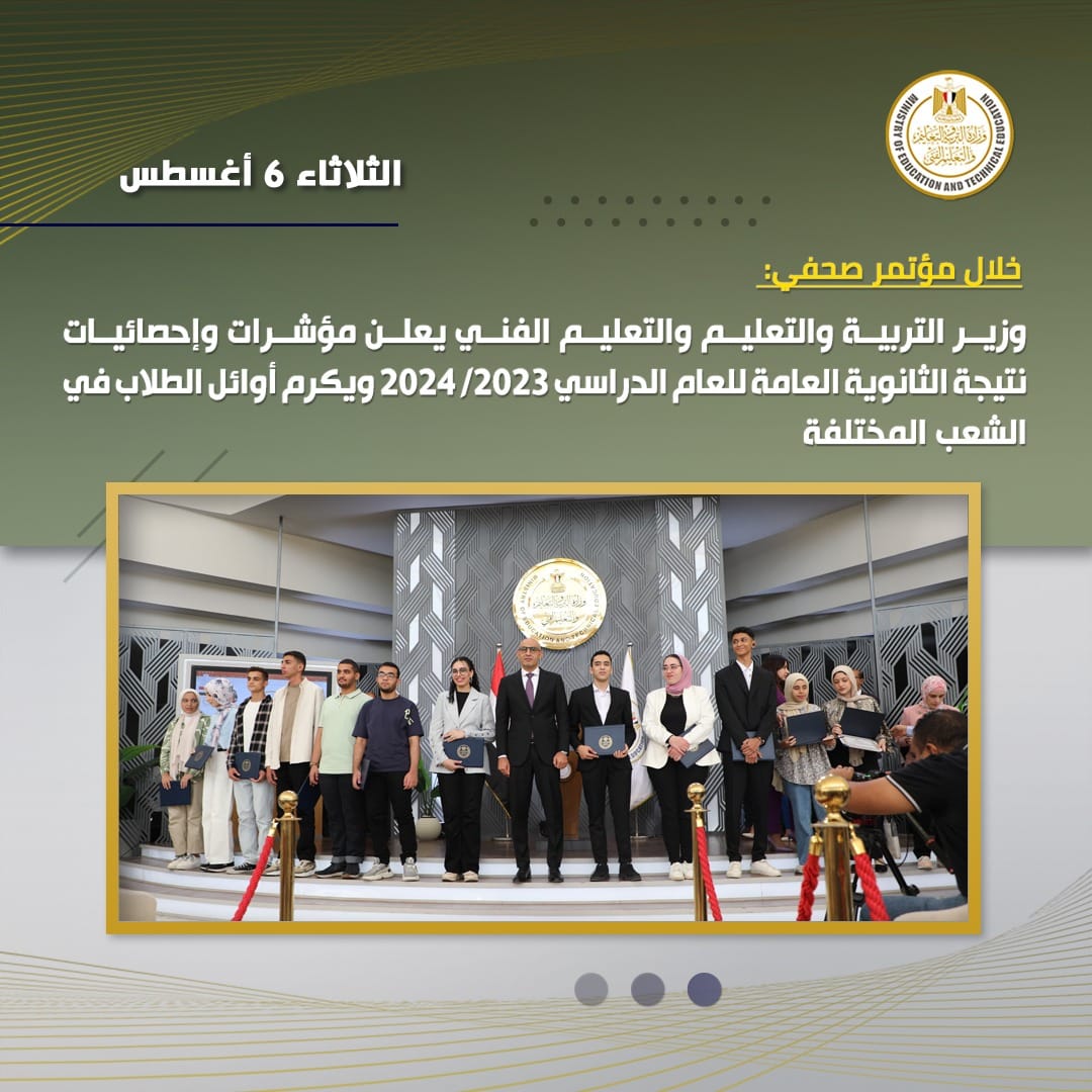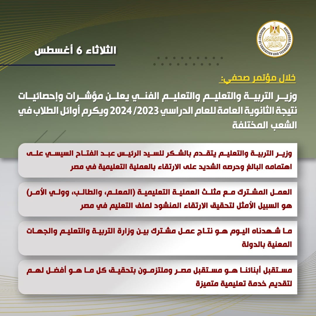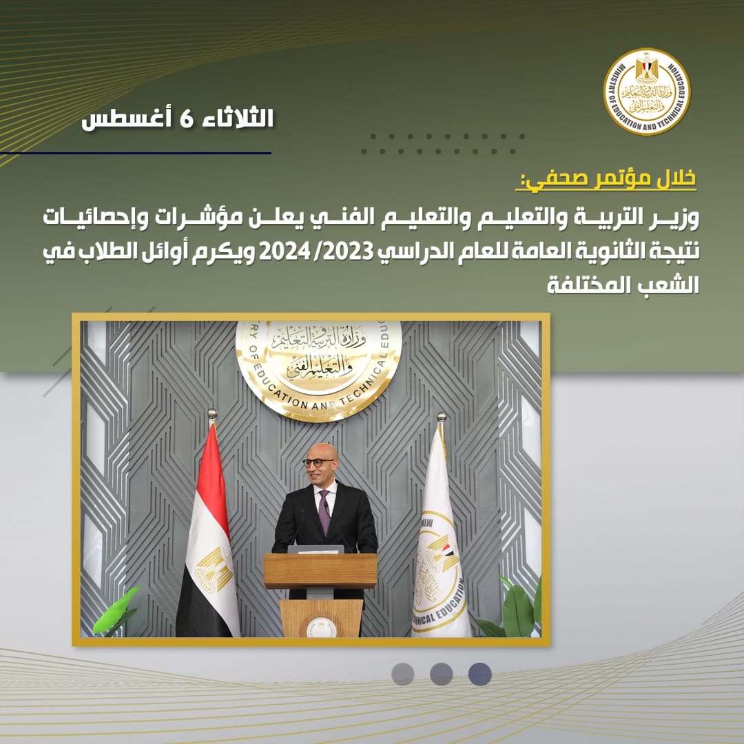 عقد السيد/ محمد عبد اللطيف وزير التربية والتعليم والتعليم الفني، الثلاثاء، مؤتمرًا صحفيًا للإعلان عن مؤشرات وإحصائيات نتيجة امتحانات شهادة الثانوية العامة للعام الدراسي ٢٠٢٣/ ٢٠٢٤.