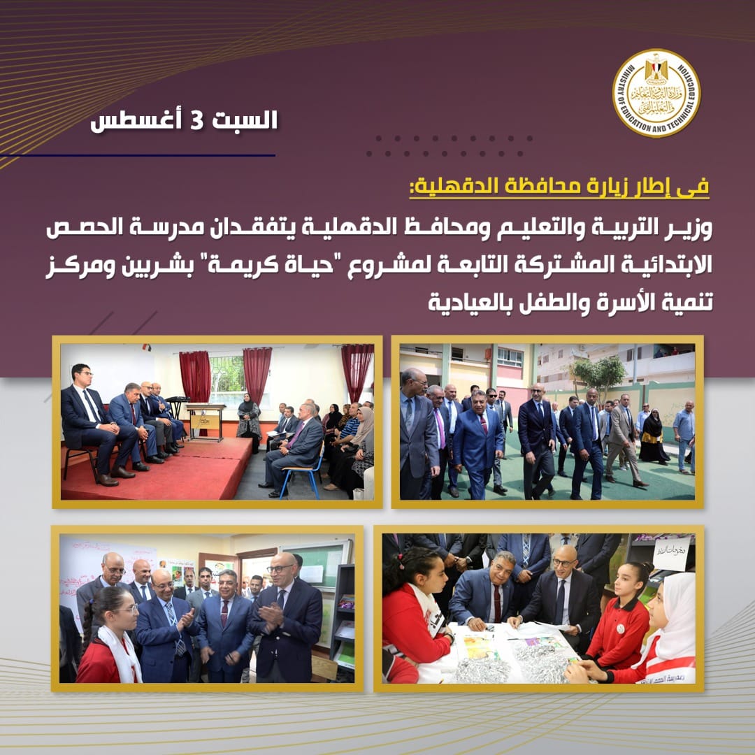 في إطار زيارة محافظة الدقهلية، قام السيد/ محمد عبد اللطيف وزير التربية والتعليم والتعليم الفني، واللواء/ طارق مرزوق محافظ الدقهلية، بجولة تفقدية لمدرسة الحصص الابتدائية المشتركة التابعة لإدارة شربين التعليمية، التي تعد من مشروعات المبادرة الرئاسية "حياة كريمة"، ومركز تنمية الأسرة والطفل بالعيادية بشربين.