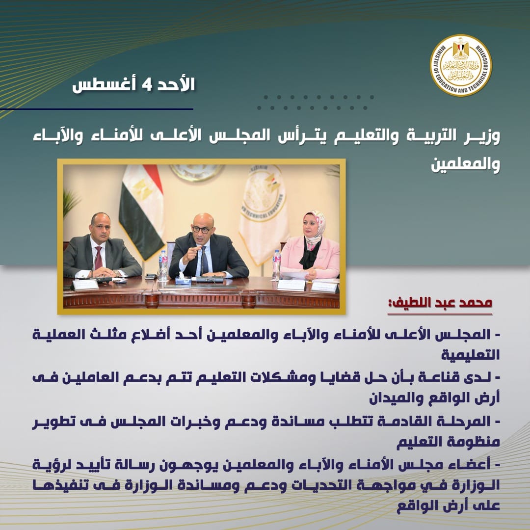 ترأس السيد/ محمد عبد اللطيف وزير التربية والتعليم والتعليم الفني، الأحد، اجتماع المجلس الأعلى للأمناء والآباء والمعلمين على مستوى الجمهورية؛ لاستعراض ومناقشة عدد من المحاور المتعلقة بتطوير منظومة التعليم قبل الجامعي.